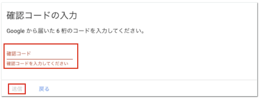 Googleから届いた6桁のコードを『確認コード』の部分に入力します。