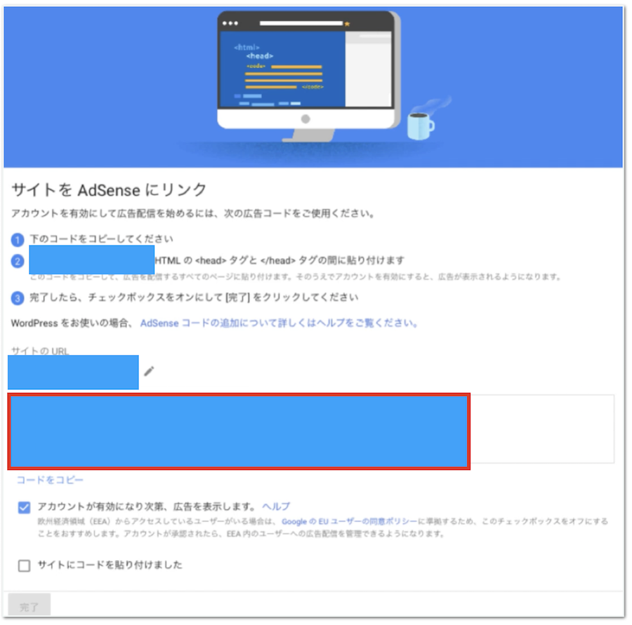 アドセンスコードを貼り付けたらGoogleアドセンスの画面へと戻り、『サイトにコードを貼り付けました』にチェックマークを入れて『完了』をクリックします。
