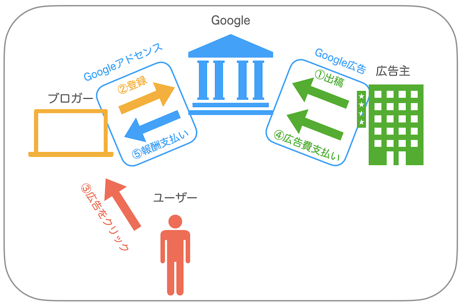 自分が運営するサイトやブログにGoogleアドセンスの広告を貼り、訪れたユーザーが広告をクリックすることで報酬が発生する仕組みになっています。