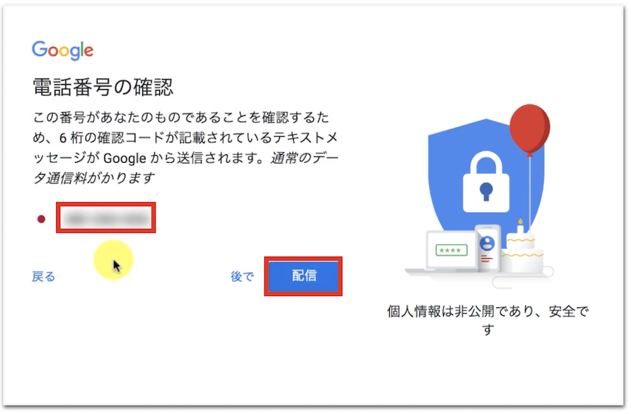 先ほど入力した電話番号に問題がなければ「配信」へと進んでいきます。
