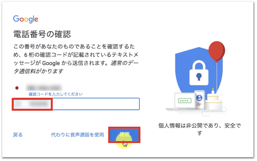 6桁の確認コードが記載されたテキストメッセージが届いたら、間違わないように入力して「確認」をクリックしてください。