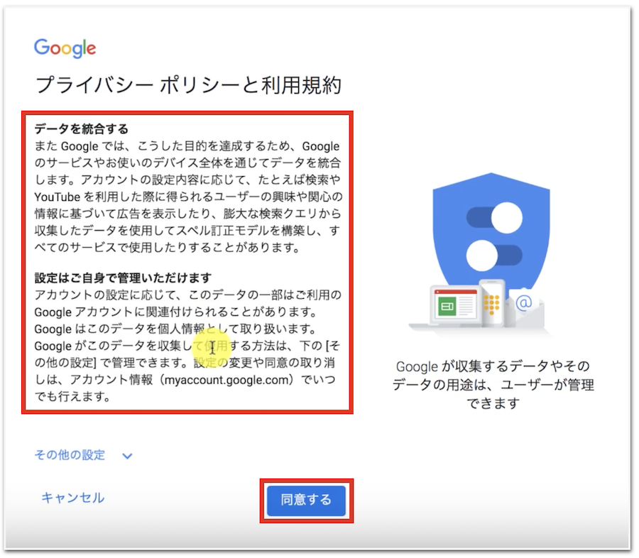 記載されたプライバシーポリシーと利用規約の内容を確認したら、「同意する」をクリックしましょう。