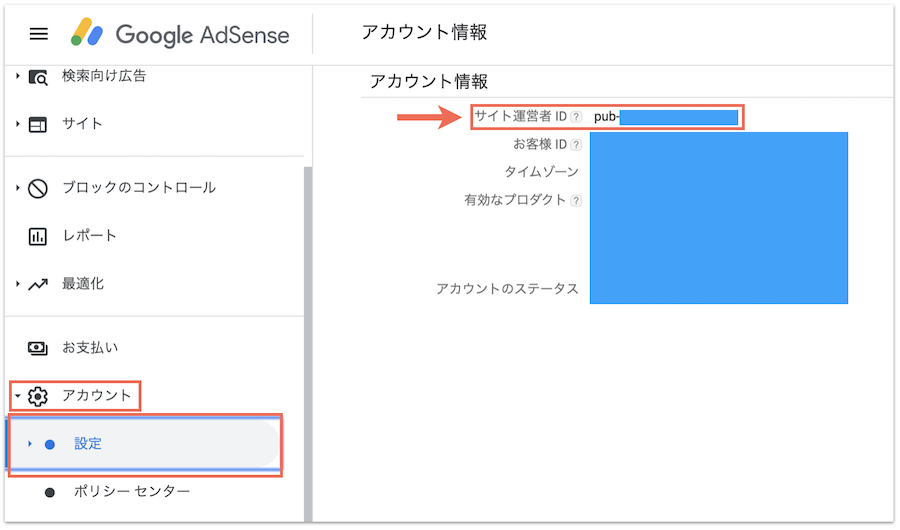 すると、上と同じ画像が表示されるので、アカウント情報のところに、あなたのサイト運営者IDが記載されています。