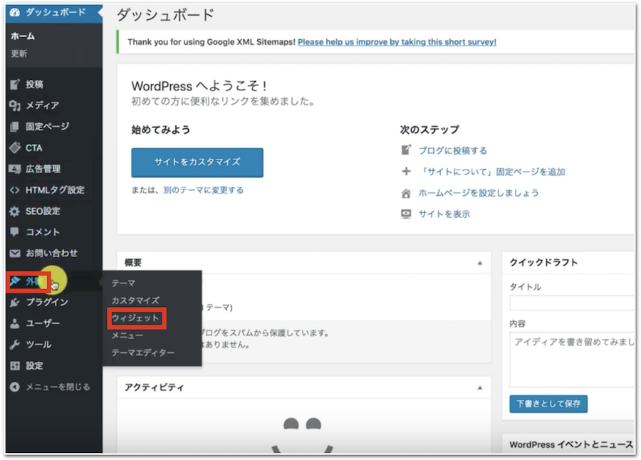 管理画面の左のメニューから、『外観』→『ウィジェット』へと進みます。