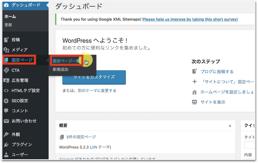 まず、管理画面の左のメニューから『固定ページ』→『固定ページ一覧』をクリックします。