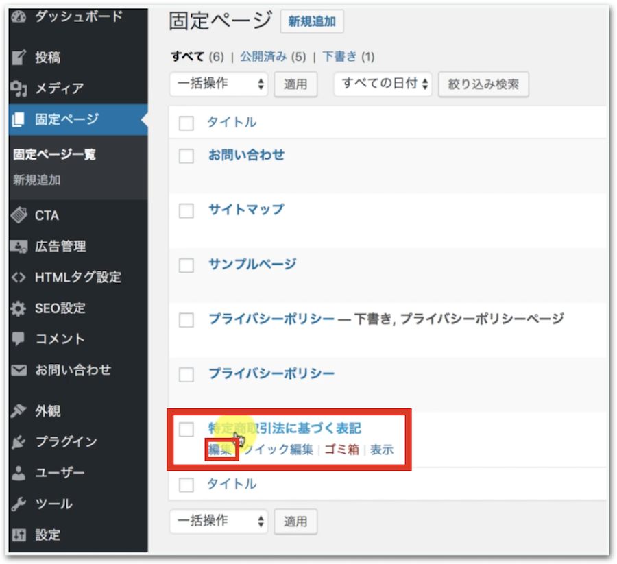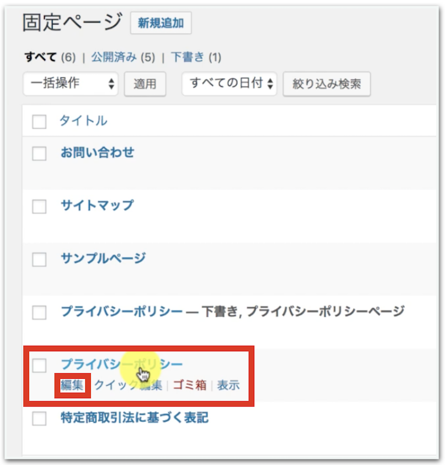 管理画面の左のメニューから、『固定ページ』→『固定ページ一覧』をクリックすると、下記のページが表示されます。