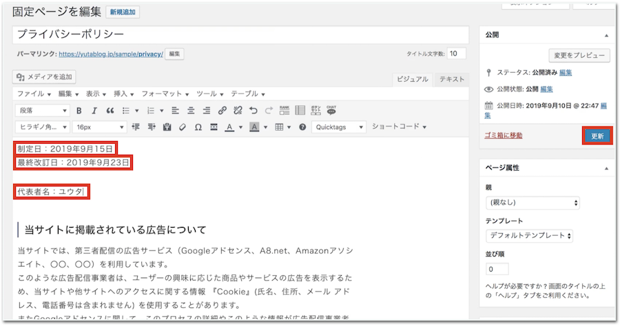 ここまでの変更ができて『更新』をクリックしたら、プライバシーポリシーの設定は完了です。