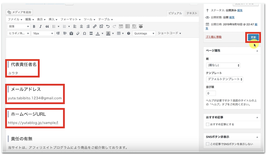 ここまでの変更ができて『更新』をクリックしたら、免責事項の設定は完了です。