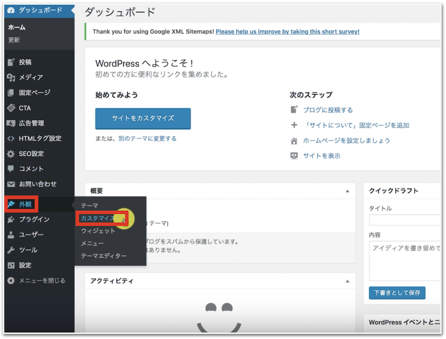 管理画面の左のメニューから、『外観』→『カスタマイズ』をクリックします。