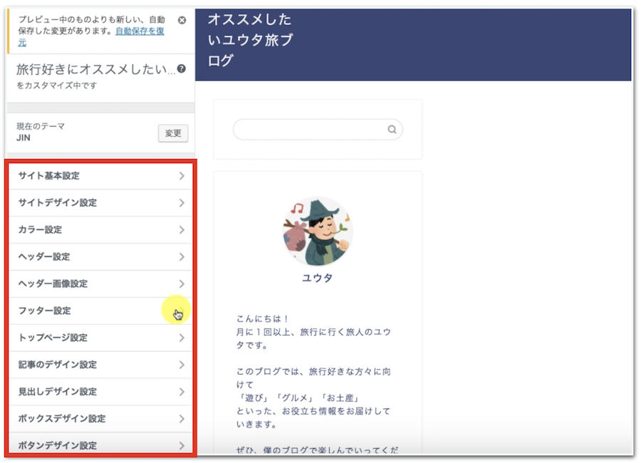 赤枠で囲った部分から自由にブログのデザインを変更することができます。