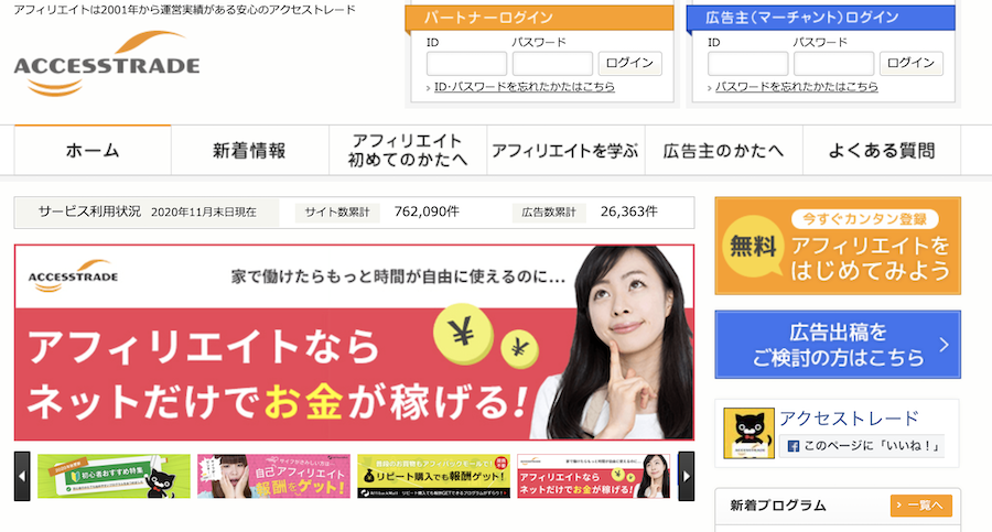 最初、アフィリエイト初心者の方は、案件数が多いASPに1つ持っておくと取り組みやすいので、大手ASPのA8.netを利用するのが良いでしょう。