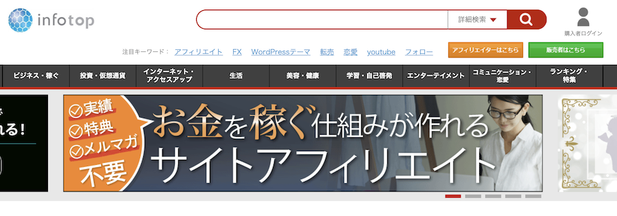 多くの情報商材は、インフォトップを通して販売されているため、ブログで情報商材系を紹介するなら、登録するのが必須と言えます。
