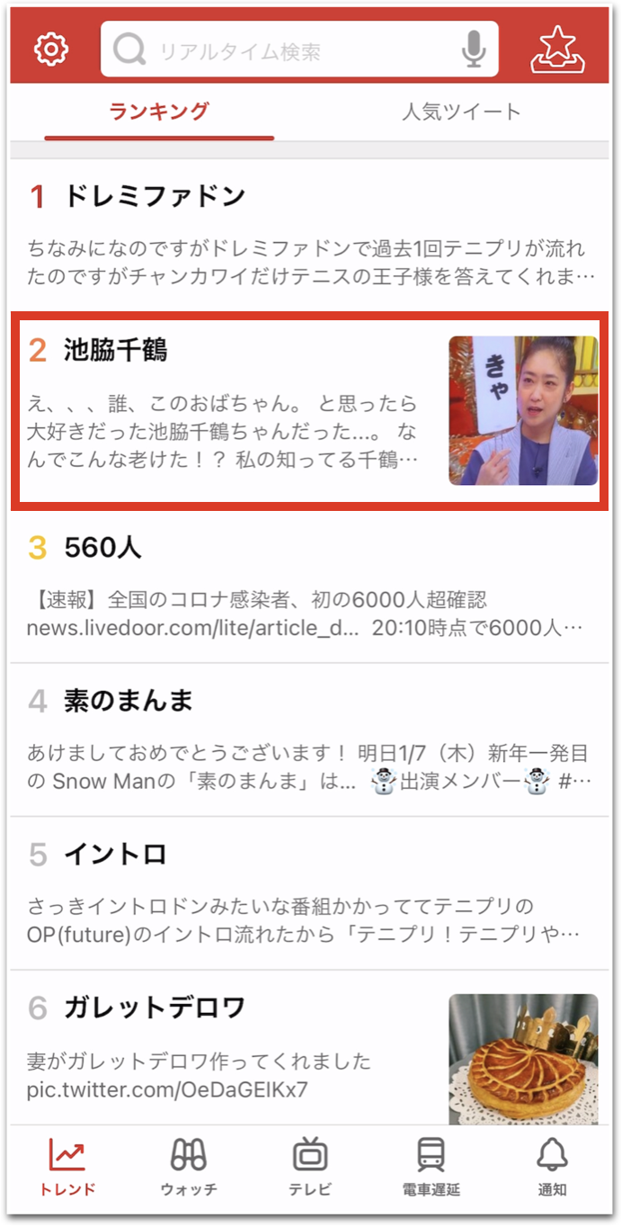 例えば、ある日のYahoo!リアルタイム検索を見ると、2位に女優の池脇千鶴さんがランクインして話題になっていました。