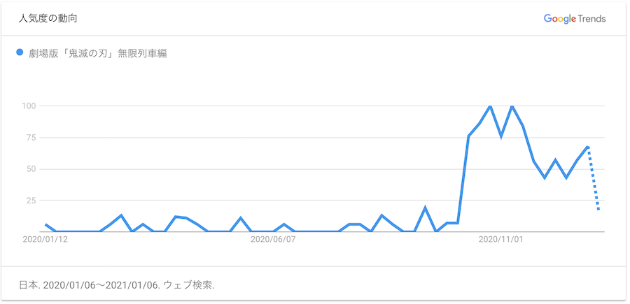 「鬼滅の刃 無限列車編」は、2020年10月16日に上映が始まったのですが、上のグラフを見て、その頃から需要が一気に高まったことが分かります。