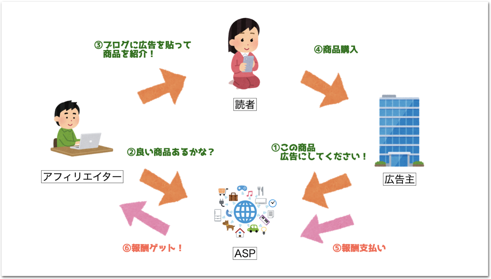 図解すると、アフィリエイトの仕組みは以下のようになっています。