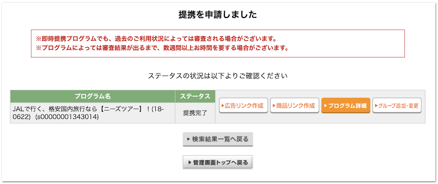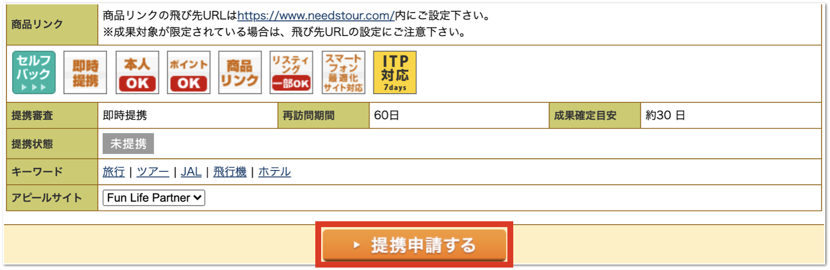 条件などに問題がないことを確認したら、「提携申請する」のボタンをクリックしましょう。