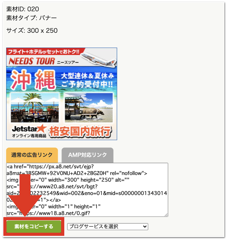 広告リンクをコピーするために、「素材をコピーする」をクリックします。