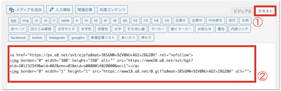 WordPressの入稿画面で、コピーした広告リンクを貼り付けます。