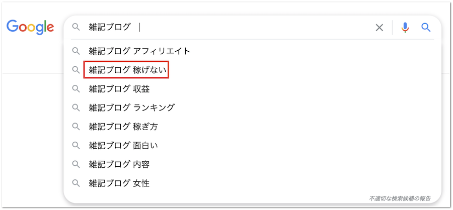 実際にGoogleの検索窓に「雑記ブログ」と入力すると、サジェストの上位に「雑記ブログ 稼げない」というキーワードが出てきます。