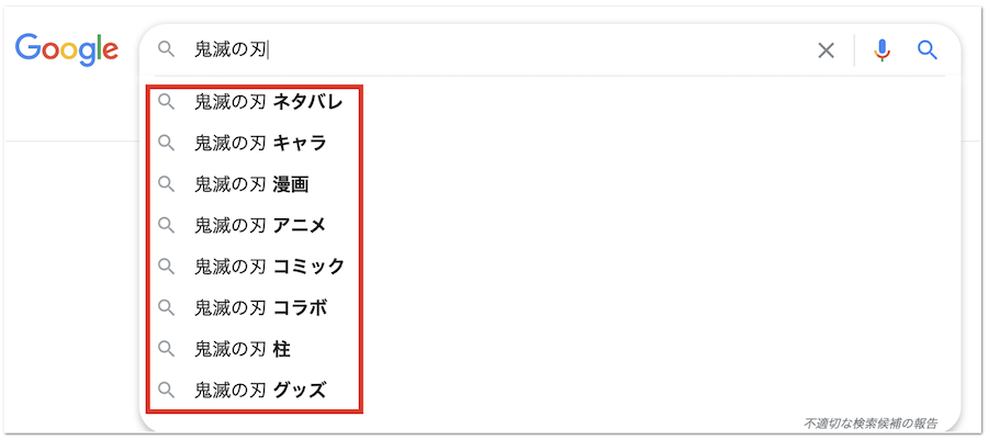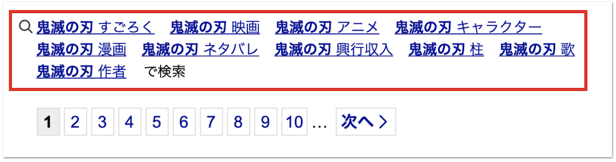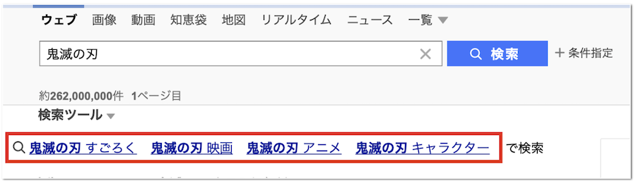 例えば、Yahoo!で「鬼滅の刃」と入力して検索すると、以下のようにメインキーワードと一緒に関連キーワードが表示されます。
