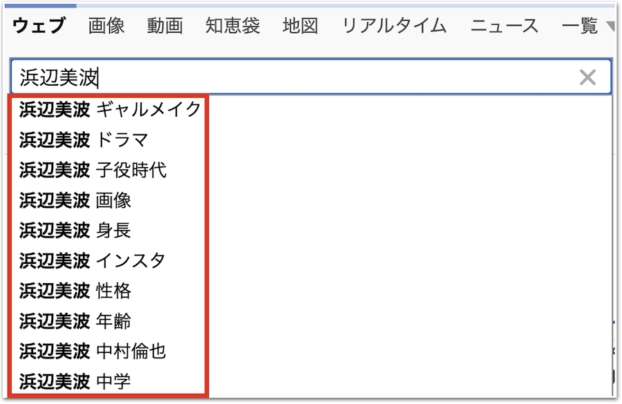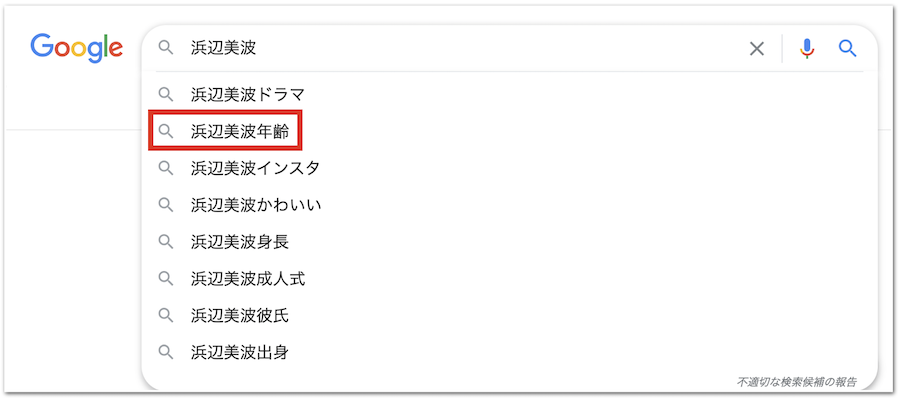 例えば、Googleで「浜辺美波」と入力すると、サジェストに「浜辺美波 年齢」いうキーワードが表示されます。
