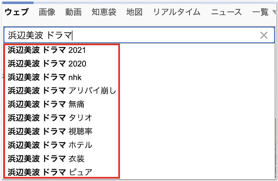 そこから、「浜辺美波 ドラマ」をクリックすると、さらに関連するキーワードが表示されることが分かります。