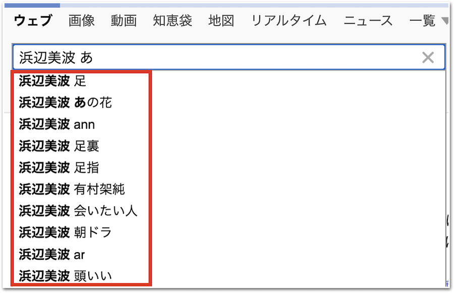 例えば、Yahoo!で「浜辺美波 あ」と入れると、「あ」に関する関連キーワードを見つけることができます。