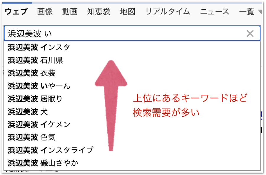 同様に、「浜辺美波 い」と入れると、「い」に関する関連キーワードが表示されます。