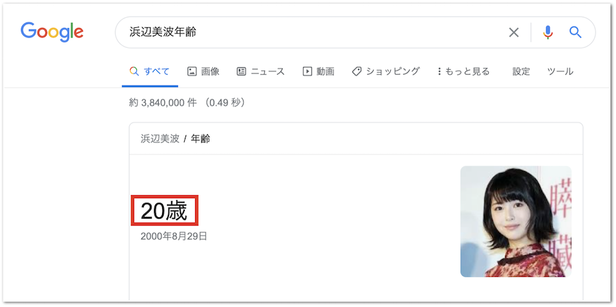 しかし、サジェストから「浜辺美波 年齢」をクリックすると、検索上位に彼女の年齢の情報が表示されます。
