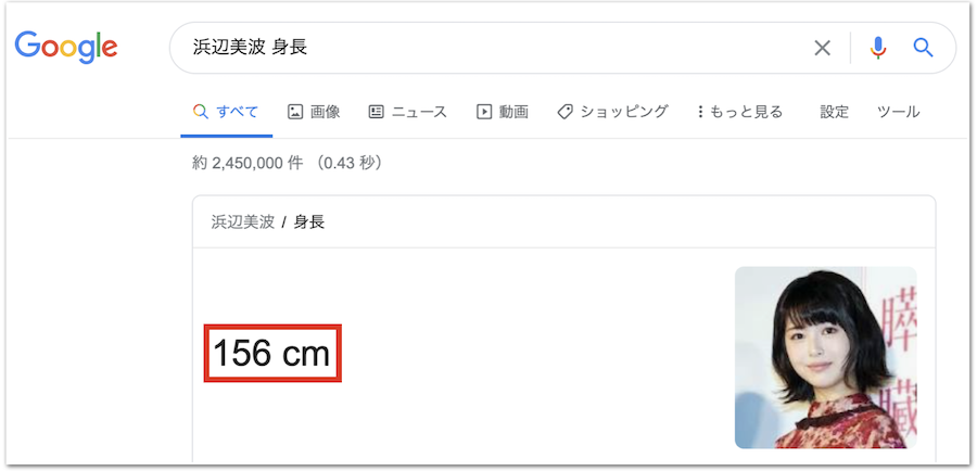 年齢の他に、「浜辺美波 身長」の場合でも、検索上位に情報が表示されます。