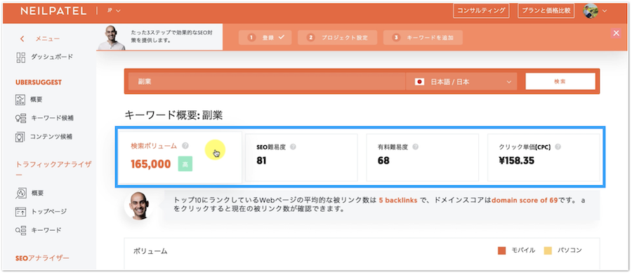 ちなみに上の画像で、「副業」の検索ボリュームは、1ヶ月で165,000件であることが確認できます。