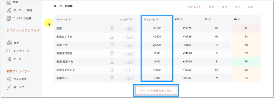 また、「副業」だけの単一だけでなく、複合キーワードの検索ボリュームも一覧で確認できます。
