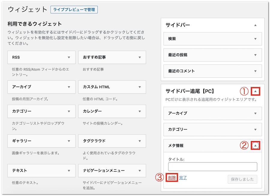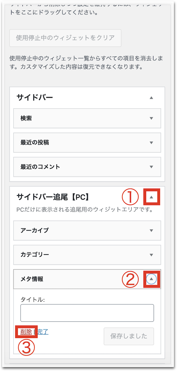 通常、メタ情報を非表示させるには、ウィジェットの編集から、サイドバーの項目にメタ情報があるので、そこから削除することができます。
