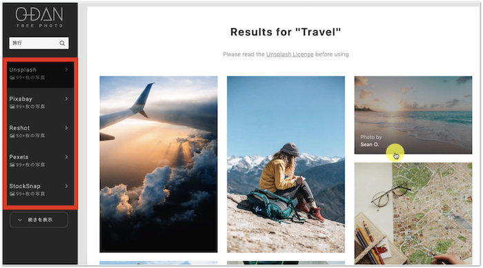 赤枠で囲った左側のメニューは「旅行」でヒットした海外の無料素材サイトが一覧で表示されます。