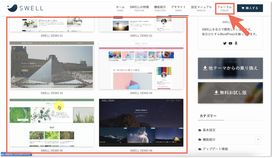お好みのデモサイトを1つ選んだら、『フォーラム』をクリックしてください。