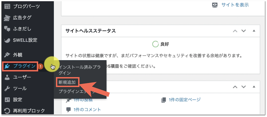 管理画面のメニューからプラグインを選択して、『新規追加』をクリックしてください。