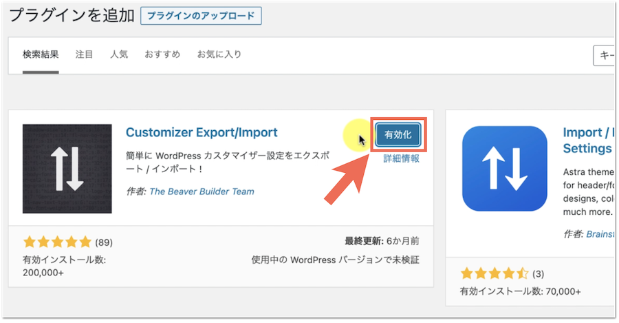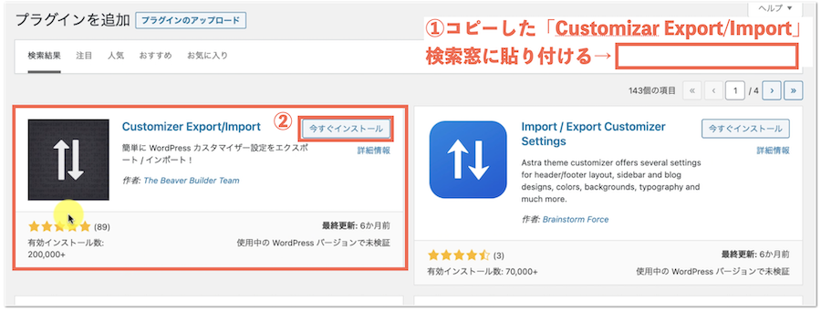 先ほどコピーした「Customizar Export/Import」を検索窓に貼り付けるとプラグインが表示されます。