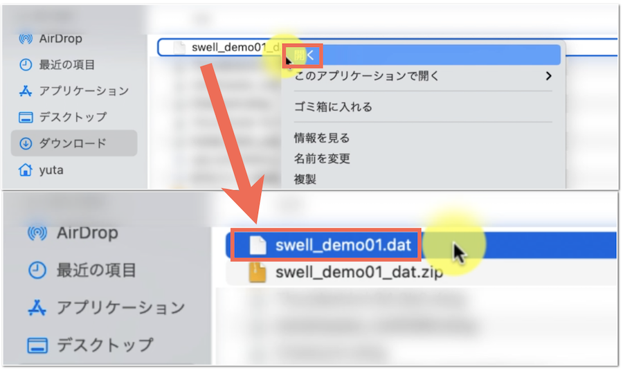 「swell_demo0○_dat.zip」のままだとデザインの着せ替えができないので、zipファイルを開いて「swell_demo0○_dat」のファイルを表示させます。
