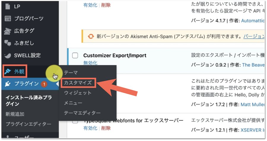 管理画面の左メニューから『外観→カスタマイズ』の手順でクリックしてください。