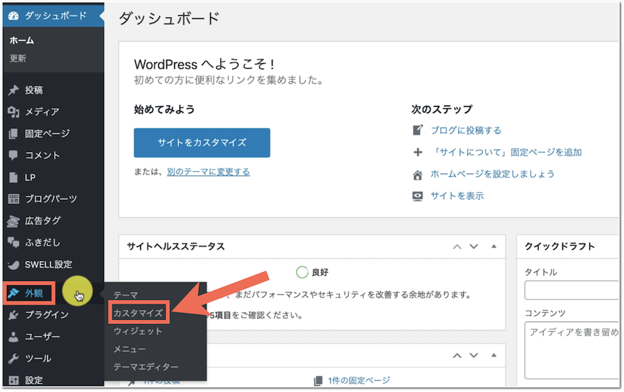 WordPressの管理画面から、『外観→カスタマイズ』と選択してクリックします。