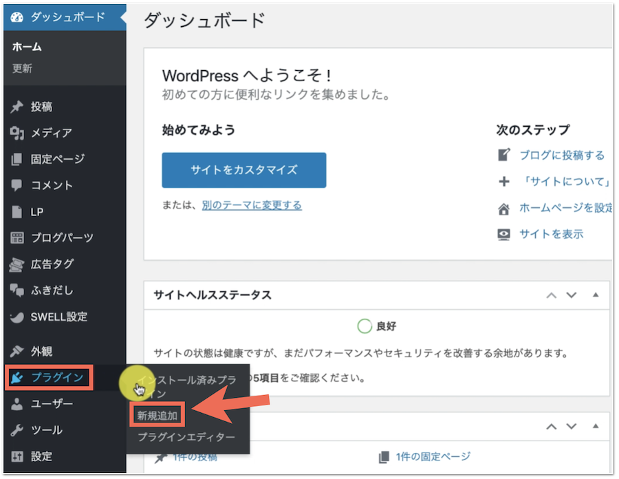 まず、WordPressの管理画面から、『プラグイン→新規追加』の手順でクリックします。
