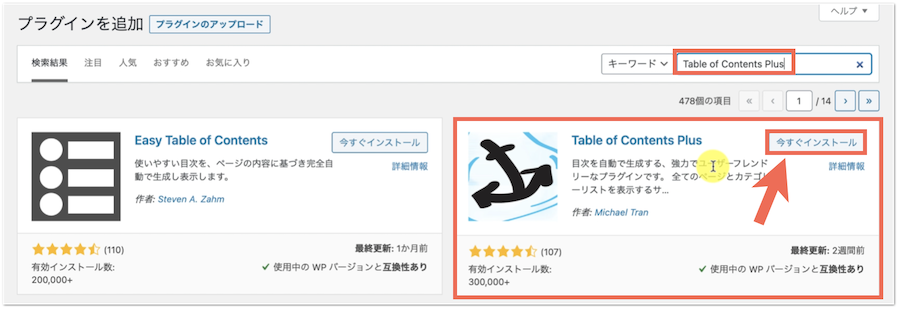 「閉じる・開く」の目次を投稿記事に表示させるために、Table of Contents Plusをインストールしていきます。