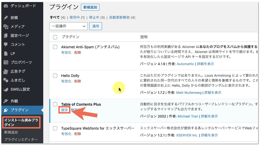 「インストール済みプラグイン」の一覧に、先ほど導入したTable of Contents Plusが表示しているので、『設定』をクリックします。
