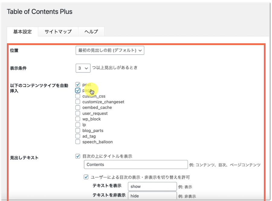 | 以下のコンテンツタイプを自動挿入 | どのページに目次を自動表示させるか設定できます。 post:投稿記事、Page:固定ページを指します。 |