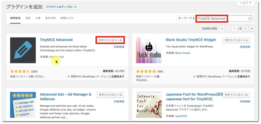 画面右上の「検索窓」に「Tiny MCE Advanced」と入力すると、Tiny MCE Advancedが表示されます。